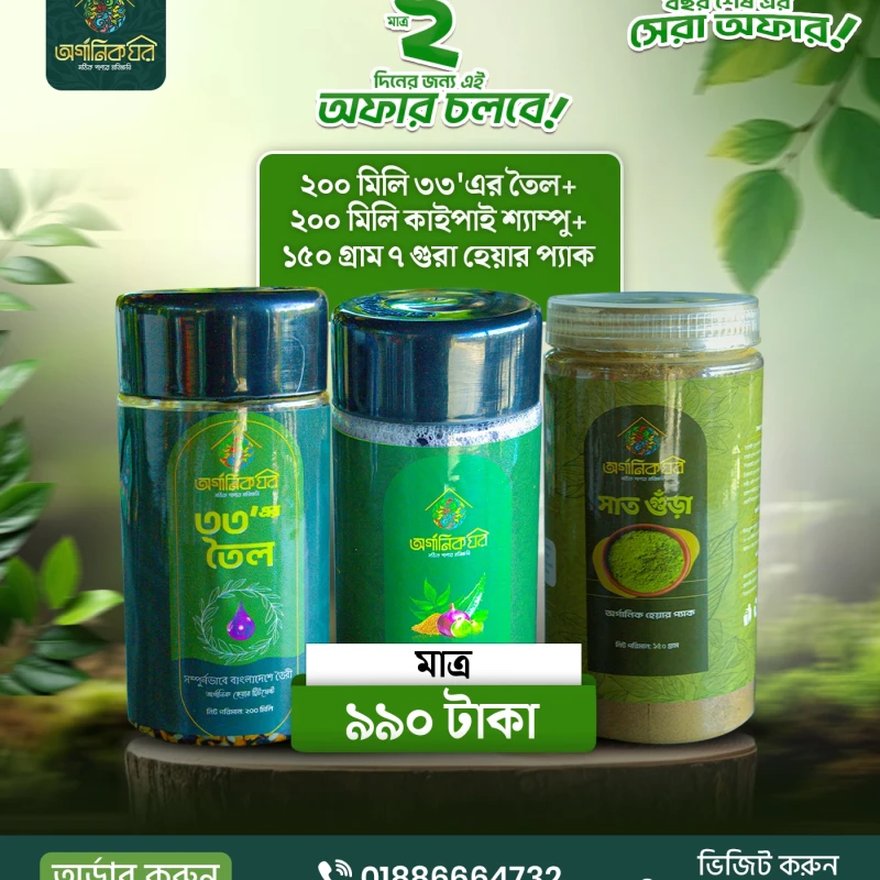 কম্বো ৩- ২০০ মিলি ৩৩'এর তৈল+২০০ মিলি কাইপাই শ্যাম্পু+১৫০ গ্রাম ৭ গুরা হেয়ার প্যাক =১২০০ টাকা