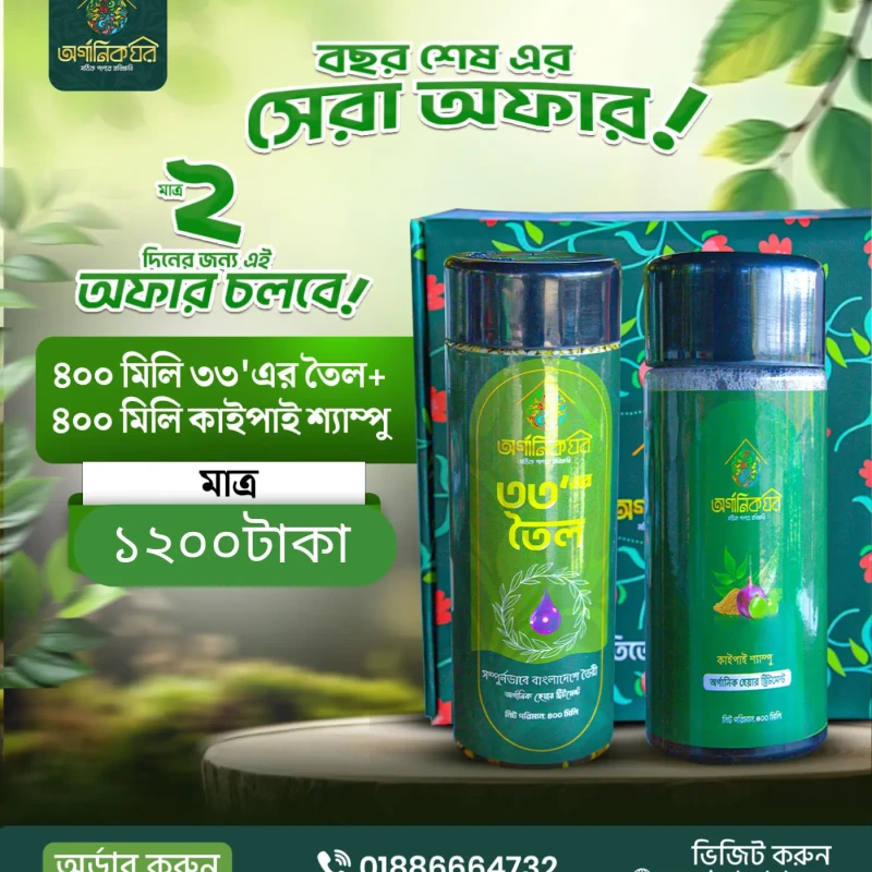 ২০০মিলি ৩৩'এর তৈল ১টি সাথে ২০০ মিলি কাইপাই শ্যাম্পু পাচ্ছেন মাত্র ৮৯৯ টাকা মাত্র