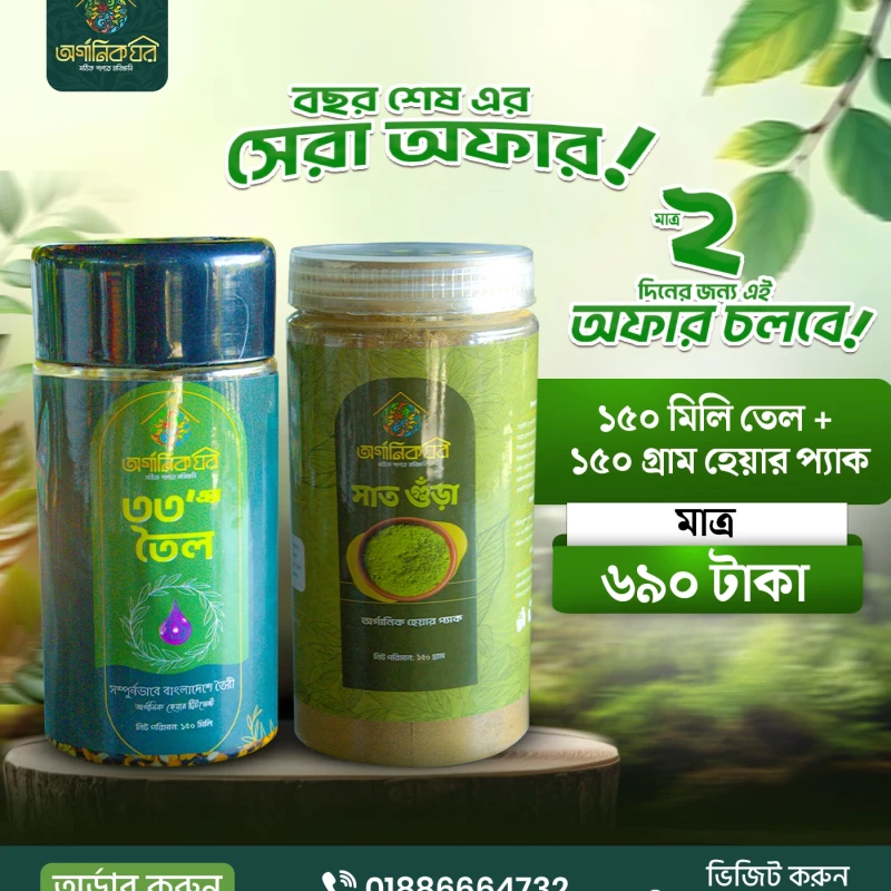 কম্ব ১- ১৫০ মিলি তেল+১৫০ গ্রাম হেয়ার প্যাক =৭৫০ টাকা। (১ মাস+)(ট্রায়াল)